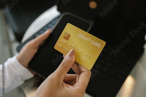 Close-up of woman holding credit card and typing on laptop, making online payment and shopping securely.
