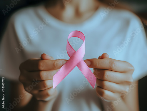 Close-up of woman holding pink ribbon with both hands. Symbol of breast cancer awareness, hope, support, strength, and prevention. Health and charity message in a simple and emotional scene.