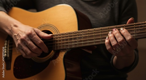 Close-up of woman playing guitar, capturing the essence of music, creativity, and personal expression, conveying a sense of passion, relaxation, and entertainment