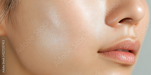 face, skin, texture, highlight, lip, gloss, closeup, woman, make-up, beauty, skincare, natural, soft, smooth, light, neutral, tone, shiny, glowing, porcelain, complexion, lipstick, peach, beige, hair, side, profile