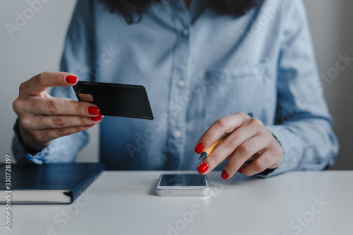 Closeup of woman's hands with red nails holding credit card and clicking mobile phone making payment online wearing blue shirt. Business, freelance, self-employment. Distance job, online work concept.