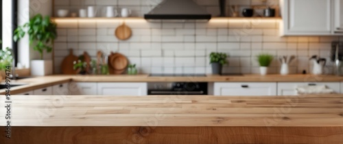 kitchen, counter, countertop, wood, wooden, table, surface, background, blur, blurred, cabinet, white, appliance, light, bright, modern, clean, minimalist, design, style, interior, home, decor, room, space, display, product, placement, empty, new, shine, grain, texture, horizontal, closeup
