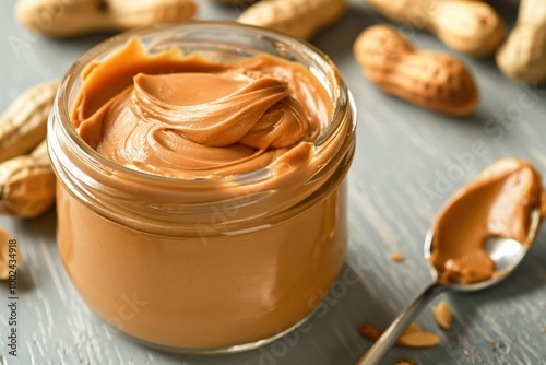 Close-up of wooden table with glass jar, spoon. Creamy peanut butter is spread on plate, healthy snack for breakfast or lunch. Freshly ground nut butter is nutritious ingredient for cooking, eating.