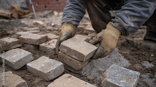 construction, men at work, hand, paving, stone, brick, ground, dirtied, dirt, concrete, work, building, project, site, job, labor, industry, manual, task, detail, closeup, texture, material, surface, rough, layer, placement, process, laying, setting, arranging, pattern, design, repair, renovation, landscape, urban, development, improvement, infrastructure, foundation, pavement, pathway, road, street, exterior, craftsmanship, skill