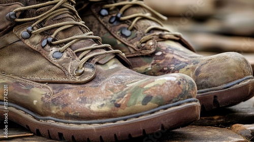 boot, camouflage, military, worn, wooden, footwear, rugged, lace, army, combat, sturdy, texture, background, protection, gear, hard-wearing, leather, hiking, trekking, vintage, adventure, fashion, tough, solid, grip, detailed, design, closeup, aged, tactical, style, earthy, strong, practical, walking, travel, lifestyle, journey, survival, rustic, equipment, classic, accurateness