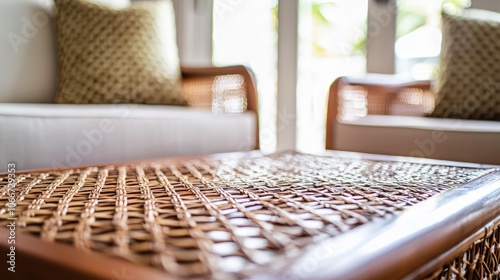 wicker, rattan, woven, furniture, table, coffee table, living room, home, interior design, design, decor, home decor, interior, style, modern, contemporary, cosy, comfort, relax, lounge, house, room, light, natural, texture, pattern, detail, closeup, sharpened, sunlight, bright, airy, elegant, minimalist, stylish, comfortable, warm, inviting, vintage, rustic
