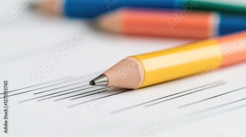 Close-up of yellow pencil on lined paper. Possible use Education, stationery