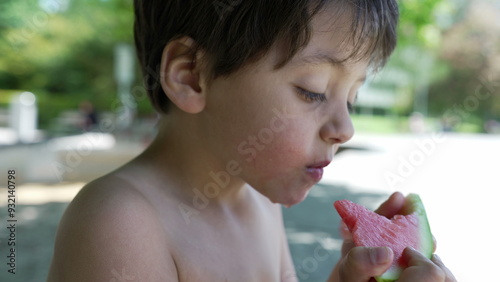 Close-up of young boy holding and eating a slice of watermelon, shirtless and focused, enjoying a refreshing summer snack, outdoor fun in the park, healthy and hydrating, playful day