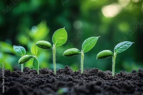 Close-up of young green bean sprouts emerging from rich dark soil with bright green blurred natural background