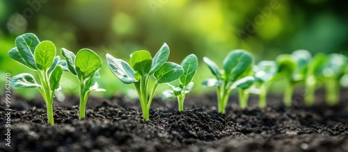 Closeup of young green plants growing in soil, with a blurred background of green leaves.
