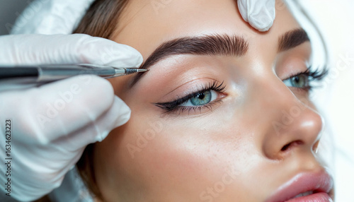 Close-up of young woman’s perfectly shaped eyebrows on bright white background.