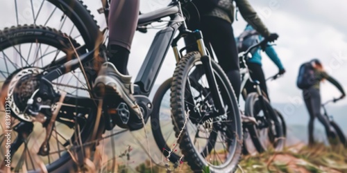 Close-up on a group using electric bikes on a mountain trail, eco-friendly transport, overcast weather.