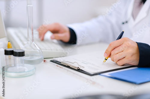 Close-up on hands of medical doctor working at office table
