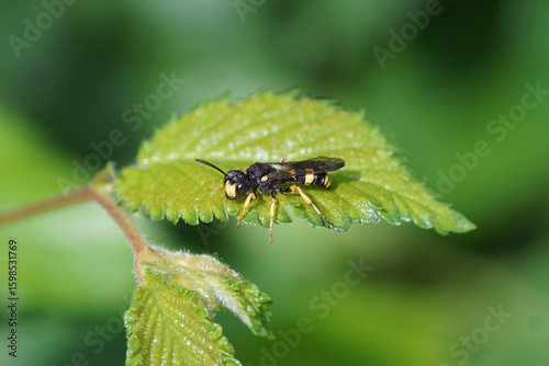 Closeup ornate tailed digger wasp Cerceris rybyensis, Family Crabronidae. On an elm leaf. Dutch garden, Spring