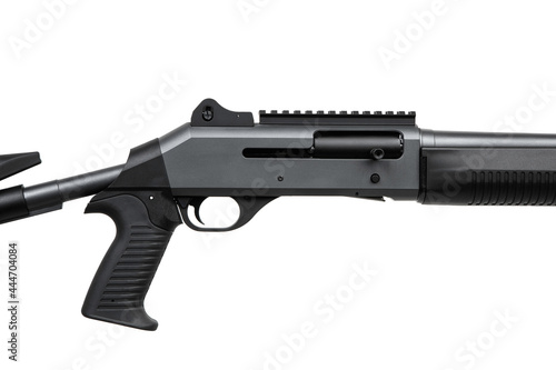 Close-up part of a modern semi-automatic shotgun. Weapons for sports and hunting. Black weapon isolate on white back