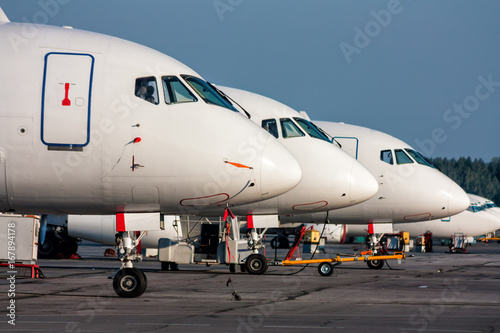 Close-up passenger airplane noses in line at the parking lot of airport