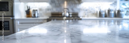 Close-up perspective of a polished marble countertop surface, with a modern kitchen blurred softly in the background. Focus on foreground texture.