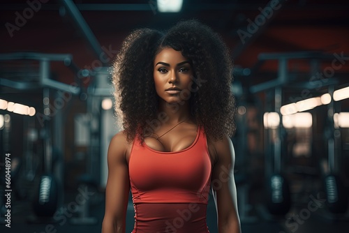 Close-up photo of a beautiful African American woman in gym. Female athlete bodybuilder, resting after cross-fit workout.