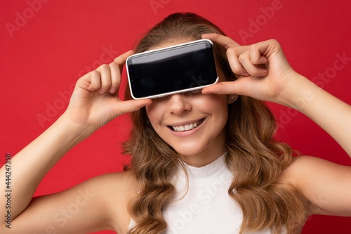 closeup Photo of beautiful smiling young woman good looking wearing casual stylish outfit standing isolated on background with copy space holding smartphone showing phone in hand with empty screen