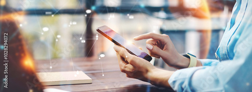 Close-up photo of female hands with smartphone. Concept of networking or remote work. Global business network.