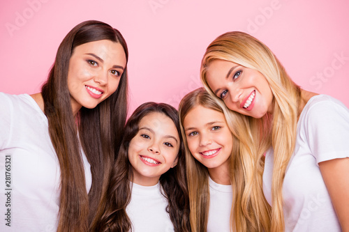 Closeup photo of four different age ladies hugging wear casual outfit isolated pink background