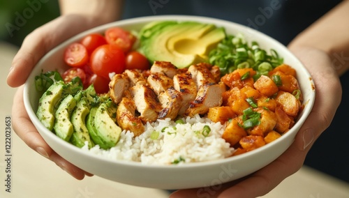 hand, holding, bowl, healthy, rice, chicken, avocado, vegetable, closeup, food, meal, lunch, dinner, fresh, eating, diet, nourishment, organic, protein, grain, vegetable, balanced, presentation, lifestyle, wholesome, salad, plate, dish, cookery, tomatoes, delicious, sauce