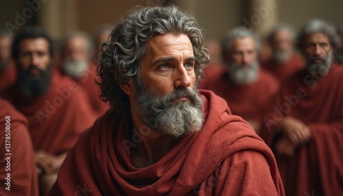 Close-up photo of Plato looking away with deep thought. Bearded man in red robe represents ancient Greek philosopher in classroom, academy. Concept of intellectual, wisdom, philosophy, education.
