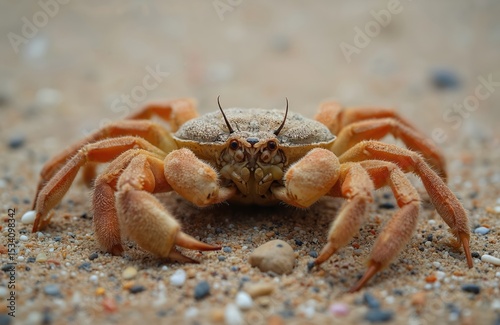 Close-up photo of sand bubbler crab on sandy beach. Crustacean animal, details of claws. Small crab in natural habitat near ocean. Summer vacation, tropical wildlife.