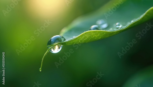 Close-up photo of water droplet suspended on leaf tip. Captures the droplet delicate balance, clarity, purity, freshness. Natural background, green tones, pure, clean, serene, macro photography.