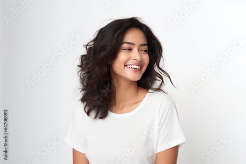 Closeup photo portrait of a beautiful young asian indian model woman smiling with clean teeth. Used for a dental ad. Isolated on light background.