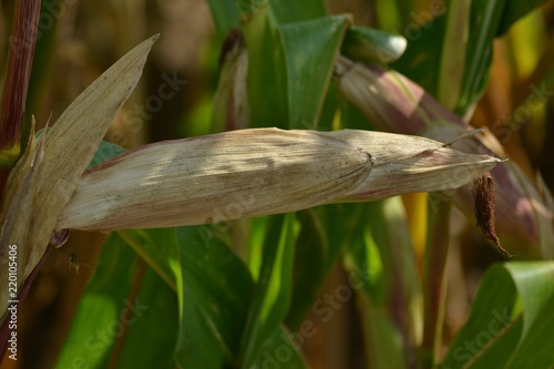 Closeup photograph of a nearly mature maize ear on a stalk in a field.