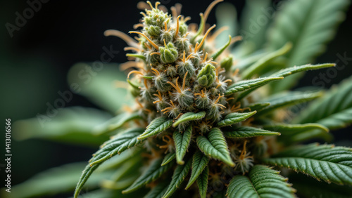 Close-up photograph of a THC-rich cannabis flower showcasing its crystalline trichomes.