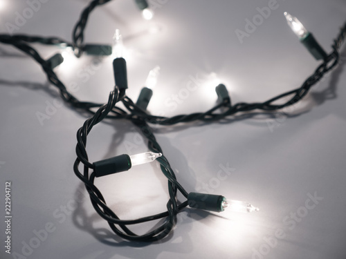Close-up photograph of real white Christmas string lights with a dark background making a festive holiday backdrop.