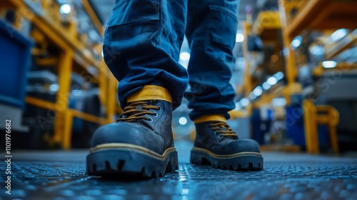 Close-up photos of Factory workers wearing safety shoes and working uniforms standing in the factory, ready for work in a dangerous workplace, Safety equipment concep
