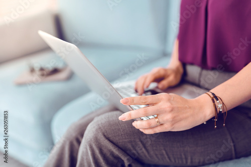 woman, dark-haired, caucasian, room, one person, psychologist, psychological, experienced, therapy, appealing, beautiful, adult, charming, elegant, sitting, stylish, couch, sofa, living room, healer, health care, help, assistance, purple, violet, style, portrait, female, lady, madam, dame, focused, pleasant, laptop, digital, working, wifely, closeup