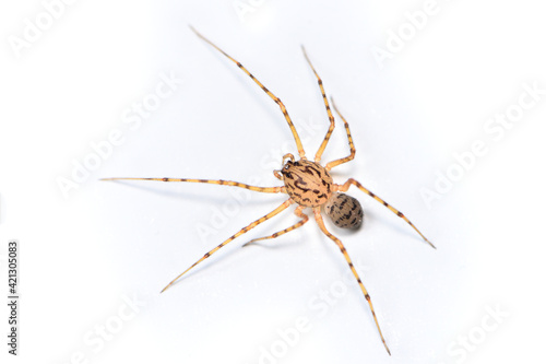 Closeup picture of the spitting spider Scytodes thoracica (Araneae: Scytodidae), a common and cosmopolitan house spider photographed on white background.