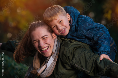 Close-up portrait - laughing positive mom and son playing together while walking in the autumn warm park
