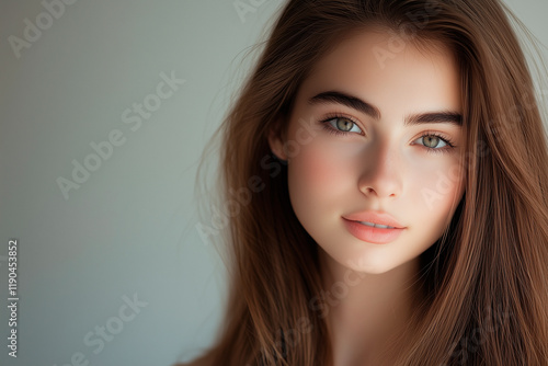 Close-up portrait of a beautiful woman with brown eyes, and natural makeup against a soft background.