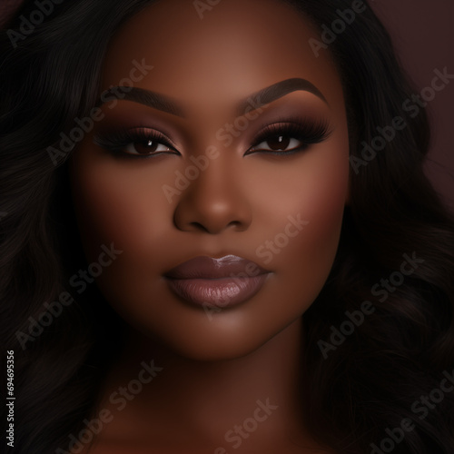 close-up portrait of a black woman with dark skin and voluminous wavy black hair. elegant makeup. full lashes shimmering eyeshadow and glossy mauve lips
