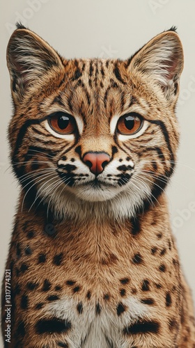 Close-up portrait of a bobcat, showcasing its striking brown and black spotted fur. The feline's intense gaze and soft fur create a captivating image.