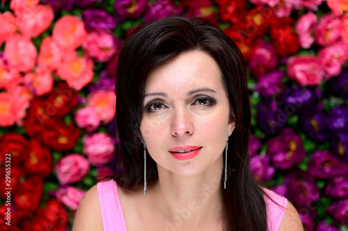 Close-up portrait of a brunette woman on a colored background. Great makeup and beautiful hair.