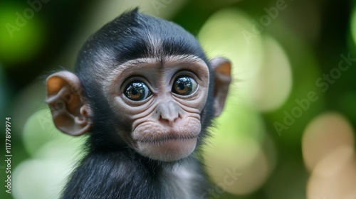monkey, primate, mammal, animal, wildlife, baby, young, cute, adorable, fauna, nature, jungle, forest, portrait, closeup, eye, face, fur, head, small, tiny, creature, wild, innocent, playful, expressive, looking, gaze, charming, sweet, dark, brown, black, green, background, bokeh, tropical, exotic, infant, closeup