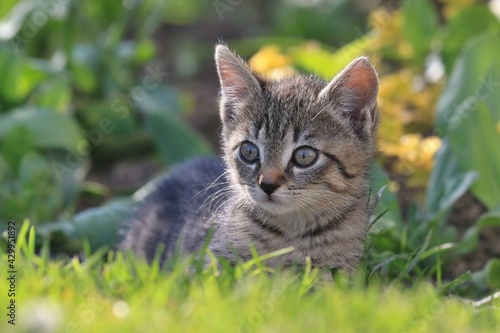 Closeup portrait of a cute tabby kitten. Kitten lying in the grass.