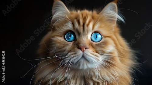 cat, ginger, fluffy, fur, eye, blue, portrait, closeup, pet, felino, animal, mammal, domestic, cute, adorable, soft, whisker, dark, background, sharpened, looking, stare, intense, gaze, curious, alert, sharp, beautiful, lovely, sweet, playful, photo, photo, closeup, detailed