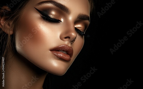 Close-up portrait of a glamorous model with smoky eye makeup, soft light illuminating her face on a solid black backdrop