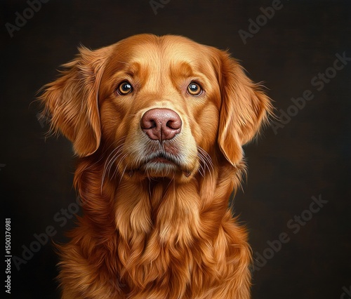 Close-up portrait of a golden retriever dog with expressive eyes and glossy fur against a dark background conveying calmness and attentiveness