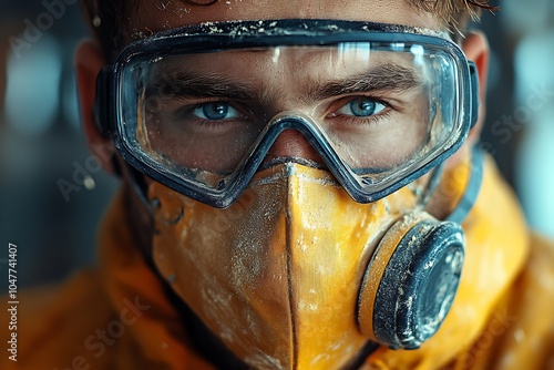 Close-up portrait of a man in a respirator and goggles