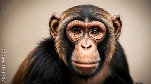 Close-up portrait of a Mixed-Breed monkey, being a hybrid of Chimpanzee and Bonobo, with a detailed view of its fur texture, facial features, and expression, showcasing its unique blend of physical ch