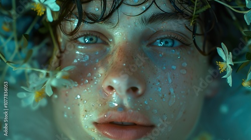 Close-Up Portrait of a Person with Water Drops and Flowers