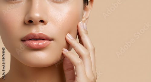 Close-Up Portrait of a Radiant Young Woman with Flawless, Smooth Skin and Soft Pink Lips on a Light Background – Perfect for Skin and Body Care Advertisements